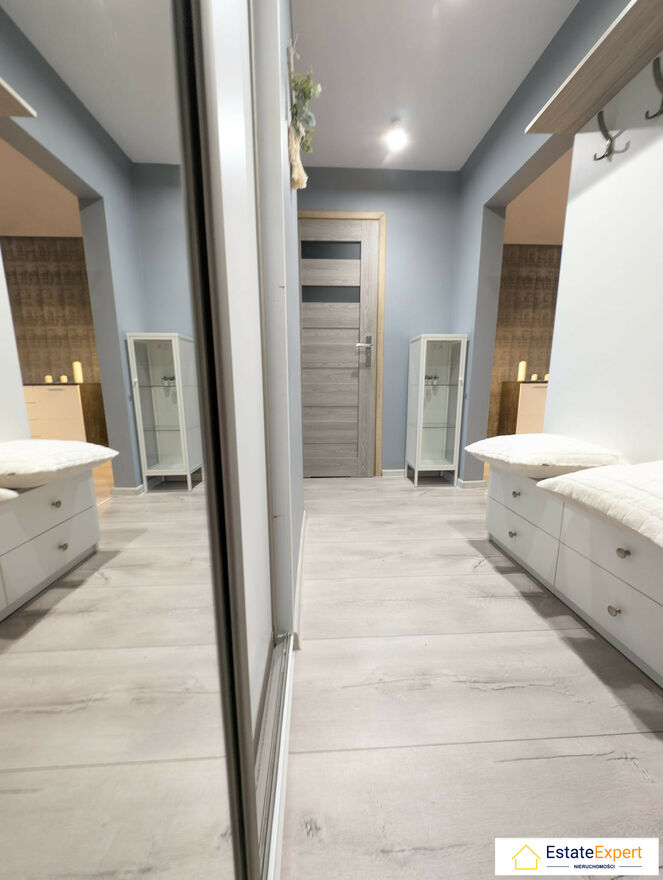 - Funkcjonalny przedpokój z pojemną szafą z lustrem.