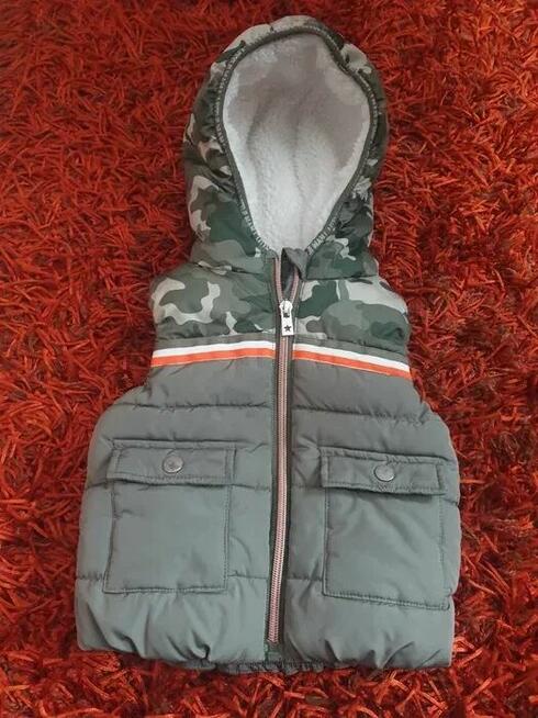 Bezrękawnik z misiem dla malucha w kolorze oliwka moro z kieszonkami Na metce 3 / 6 m-cy ale myślę że do ...
