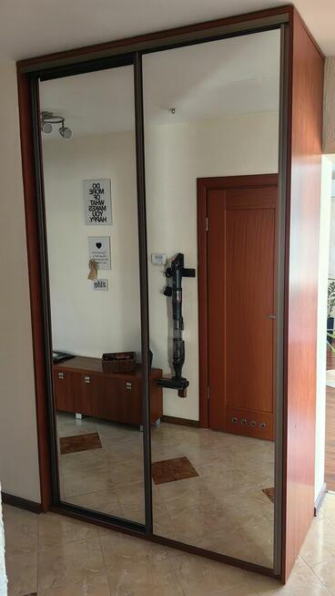Używana szafa w kolorze kalwados w dobrym stanie z półkami i drążkiem na wieszaki. Dużym atutem są dwa przesuwne duże ...