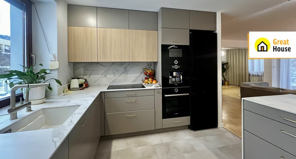 - Kuchnia w pełnej zabudowie, z dużą ilością szafek do sufitu, wyposażona w: