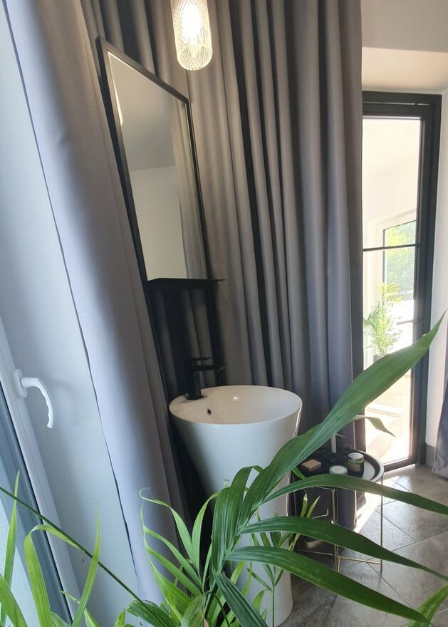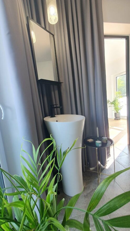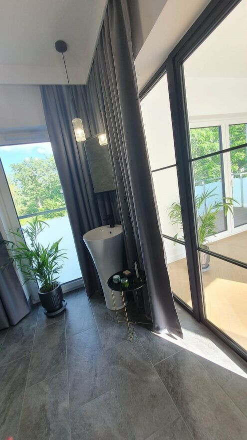 I piętro - 2 pokoje każdy z balkonem i własną łazienką. Głowna sypialnia z duzą garderobą.
