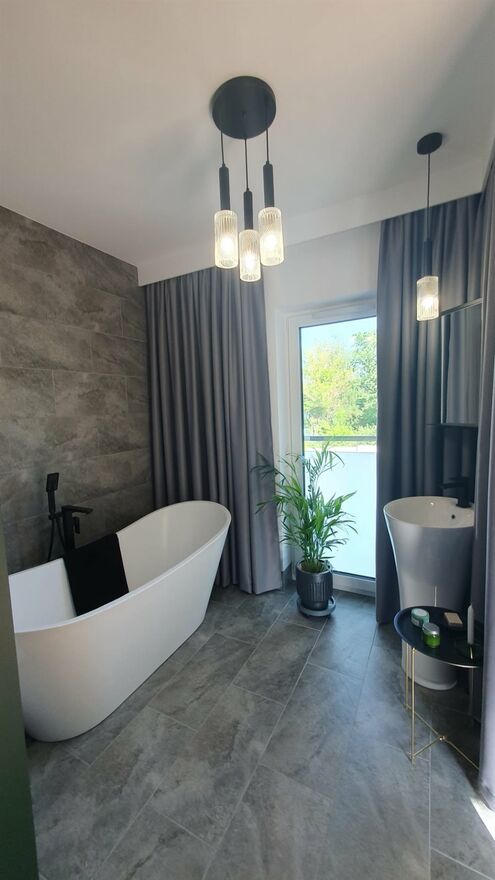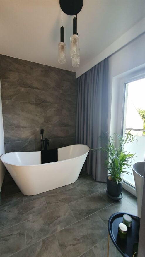 Segment w pełni wykończony w wysokim standardzie. Na podłogach w pokojach oraz salonie naturalny parkiet drewniany. W łazienkach wysokiej jakości płytki oraz armatura renomowanych producentów. Dom w pełni wyposażony w niezbędny sprzęt AGD (lodówka w zabudowie, zmywarka, pralko-szuszarka, okap) renomowanych producentów. Na pierwszym oraz drugim piętrze klimatyzacja.