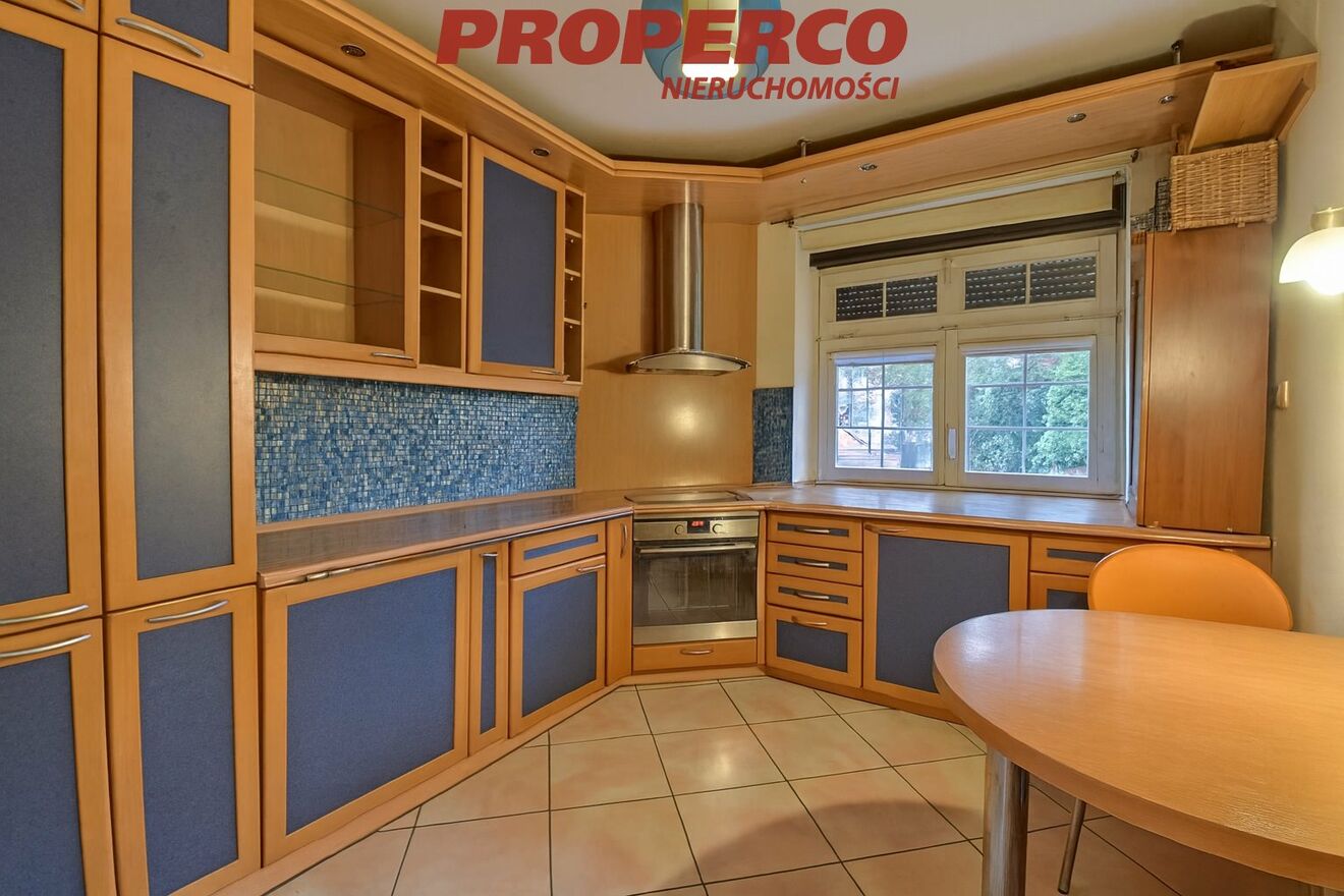 Na podłogach w pokojach i korytarzach - parkiet, w łazienkach, kuchni i piwnicy - gresy. Stolarka okienna drewniana w dobrym stanie. Zamontowano rolety antywłamaniowe.
