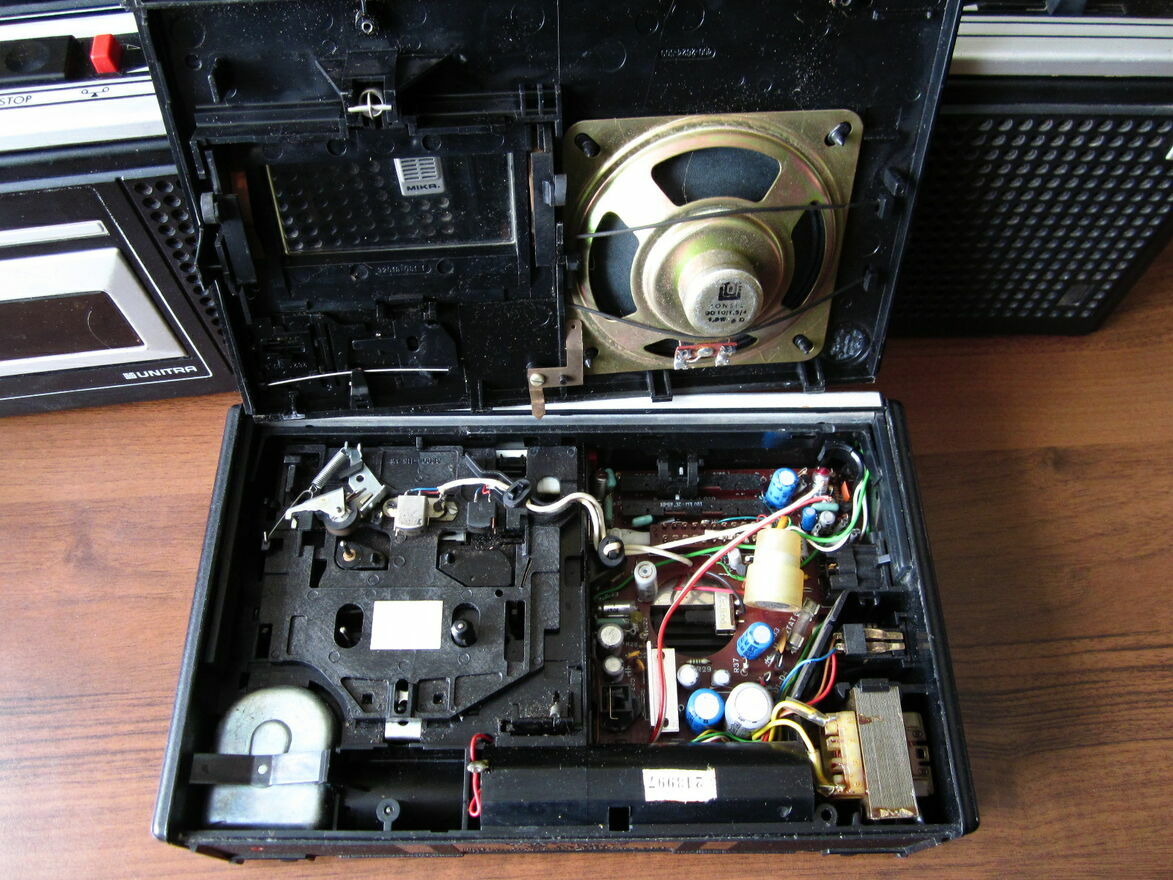 Magnetofon w stanie dostatecznym plus. Przy przyciskach lakier nie wytarty. Mechanika działa, jednak jest brak paska napędowego co uniemożliwia pełne sprawdzenie. Niemniej przyciski wchodzą, przełącznik przesuwu taśmy idzie w skrajne położenie i wraca. Przyciski włączają silnik a głośnika wydobywa się zakłócenie w tym czasie, czyli magnetofon żyje. Czy odtwarza dźwięk nie wiadomo. Głowica jest, klapka na kasetę otwiera się. Na klapce są ze 3 malutkie wgniecenia.