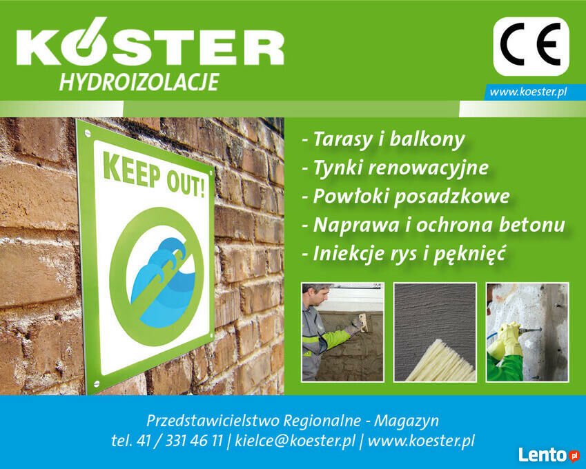 SPECJALISTYCZNE HYDROIZOLACJE I USZCZELNIENIA BUDYNKÓW i BUDOWLI marki Koster - bitumiczne izolacje przeciwwodne i przeciwwilgociowe fundamentów, ścian piwnic - typu KMB, uszczelnienia mineralne (szlamy) tarasów, balkonów, zbiorników, dodatki do betonów, impregnaty, preparaty do odtwarzania izolacji poziomych budynków, tynki renowacyjne na zawilgocone i zasolone mury, zaprawy typu PCC do naprawy konstrukcji betonowych, żywice iniekcyjne poliuretanowe i epoksydowe, membrany dachowe TPO "NOWOŚĆ", preparaty gruntujące i masy uszczelniające.DORADZTWO TECHNICZNE I SPRZEDAŻ.