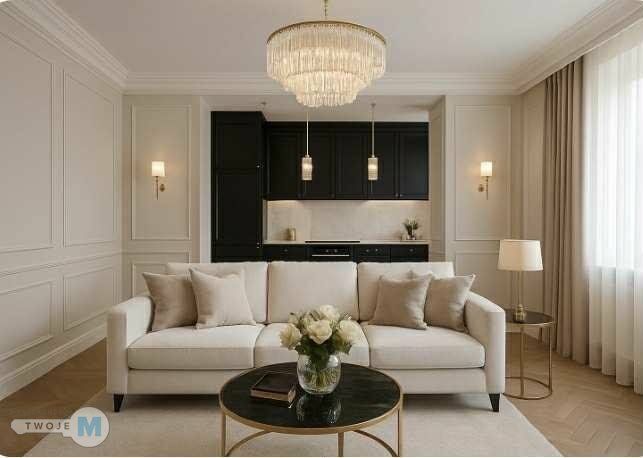 - ustawny salon z aneksem kuchennym z wyjściem na balkon