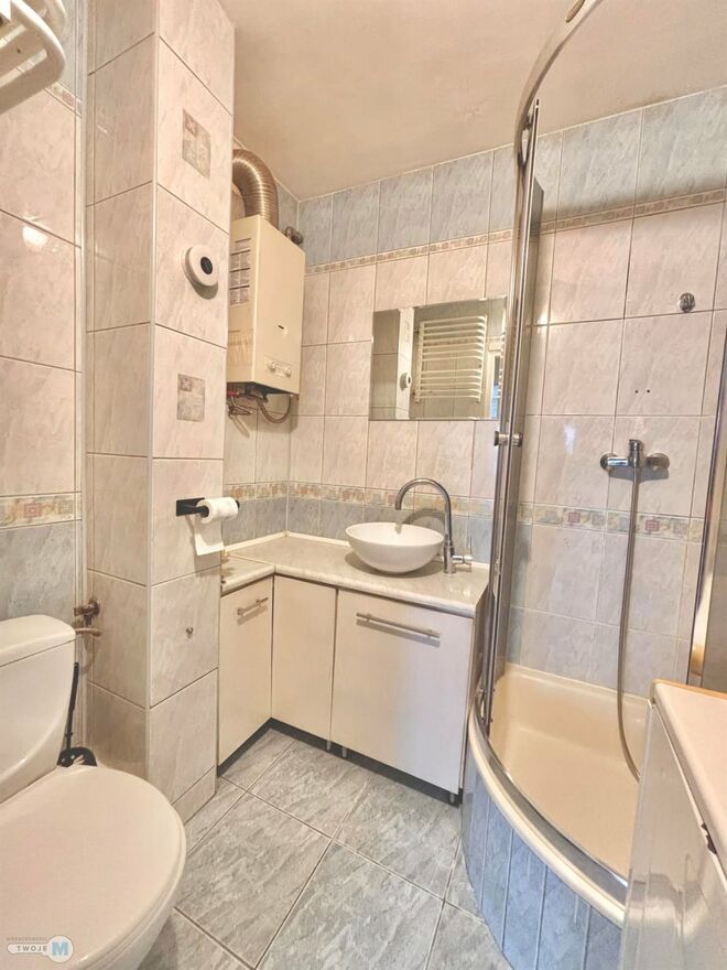 Kuchnia wyposażony w kuchenkę, czajnik elektryczny oraz lodówkę. Łazienka - wyposażona w prysznic, umywalkę, szafkę, lustro, WC, pralkę. Mieszkanie umeblowane, przestronne, doskonałe dla jednej osoby lub dla pary. Ogrzewanie miejskie, ciepła woda z piecyka gazowego.