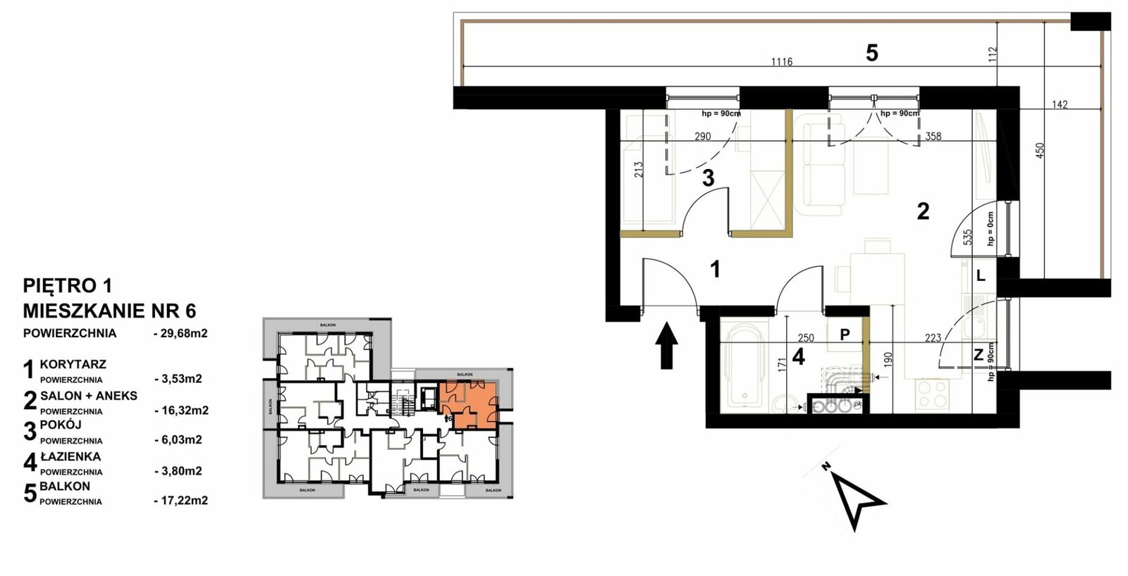 Mieszkanie składa się z sypialni, salonu z aneksem kuchennym, łazienki, korytarza oraz dużego balkonu o powierzchni aż 17,22 m2.