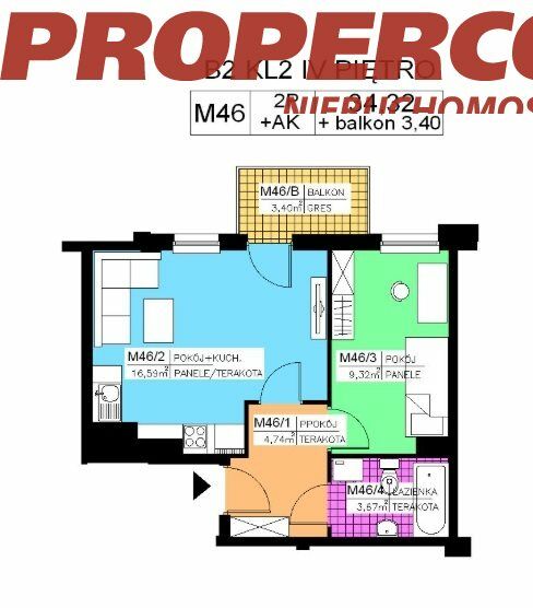 Do mieszkania przynależy balkon o pow. 3,4m2.