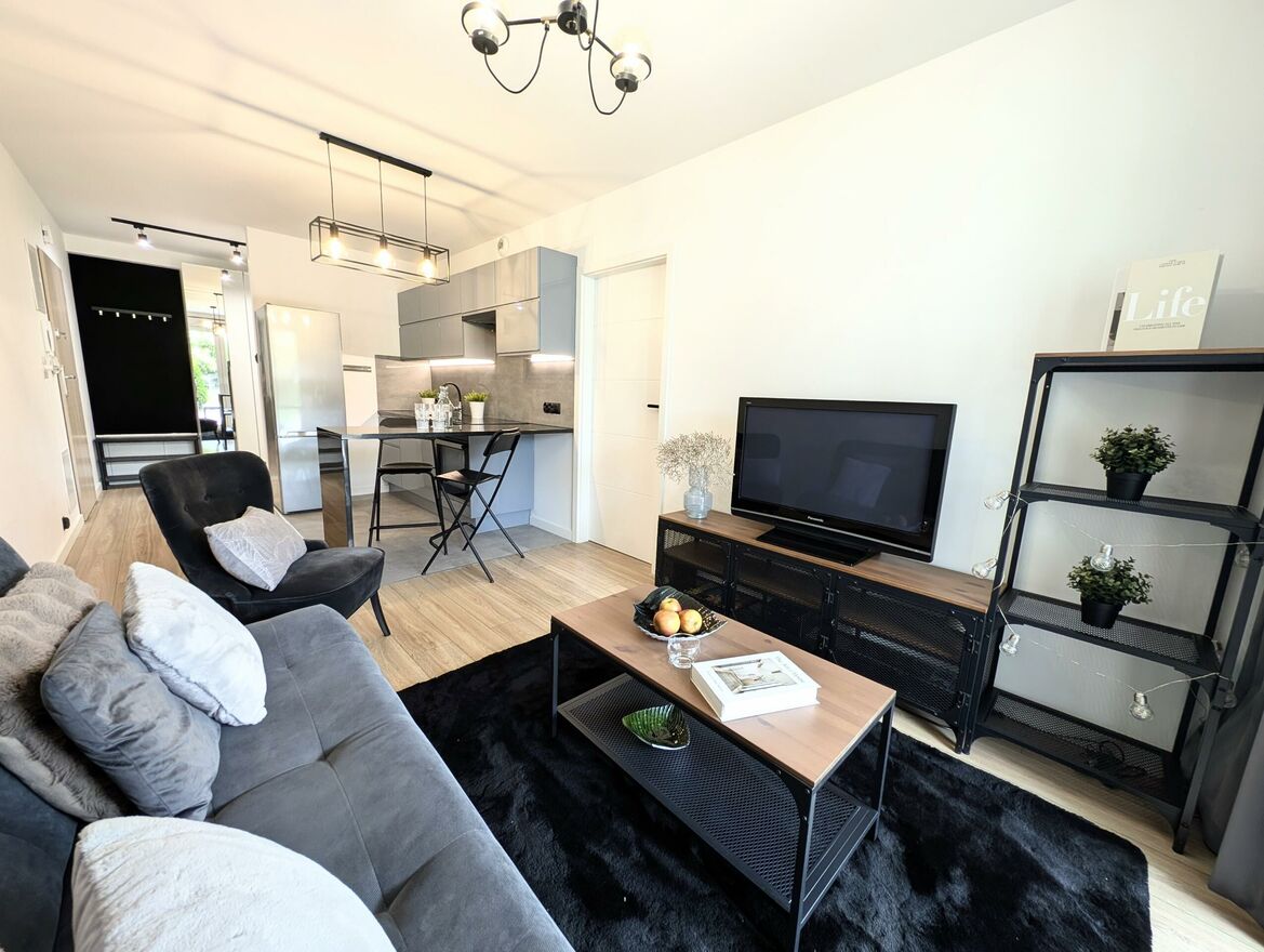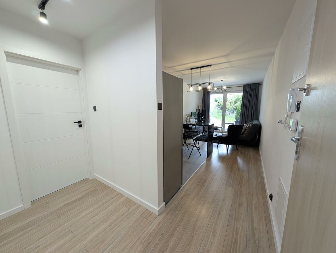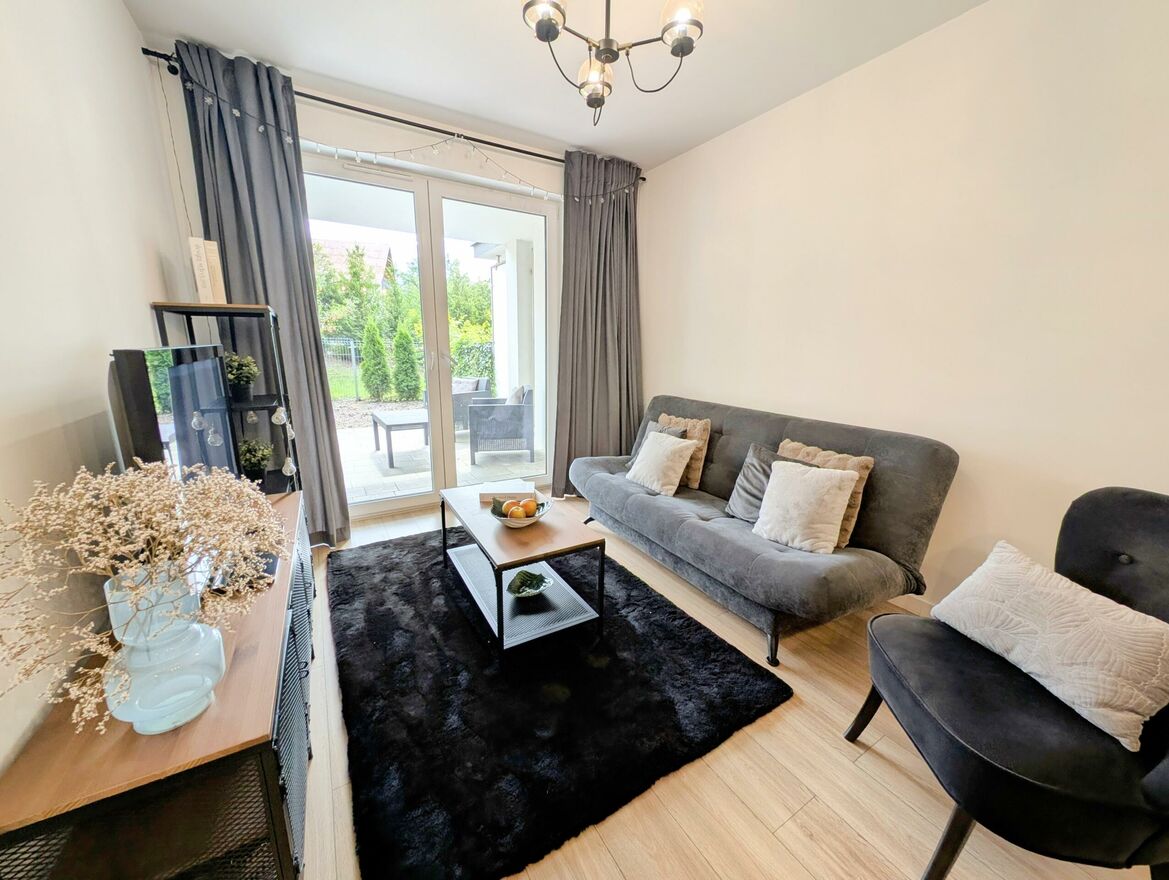 Mieszkanie ma bardzo przemyślany układ pomieszczeń: osoba sypialnia, salon z aneksem kuchennym, z którego mamy wyjście na taras/ogródek. Przedpokój funkcjonalny z dużą ilością miejsca do przechowywania oraz łazienka z wanną oraz prysznicem. Nieruchomość sprzedawana jest z pełnym umeblowaniem i sprzętami wysokiej jakości. Mieszkanie jest bardzo zadbane i umeblowane z dbałością o najmniejszy szczegół. Nie wymaga żadnego nakładu finansowego.