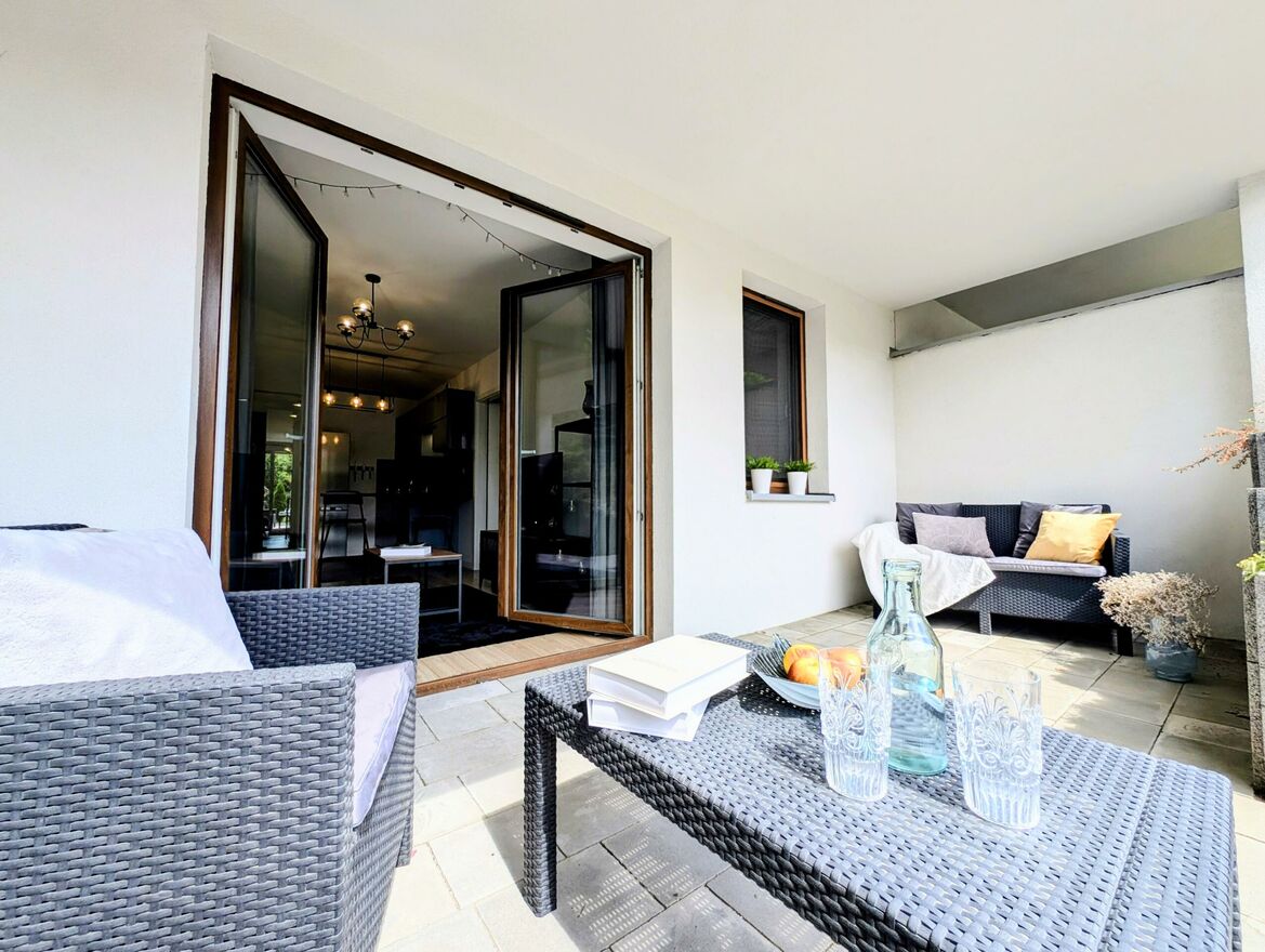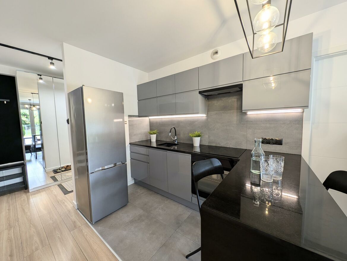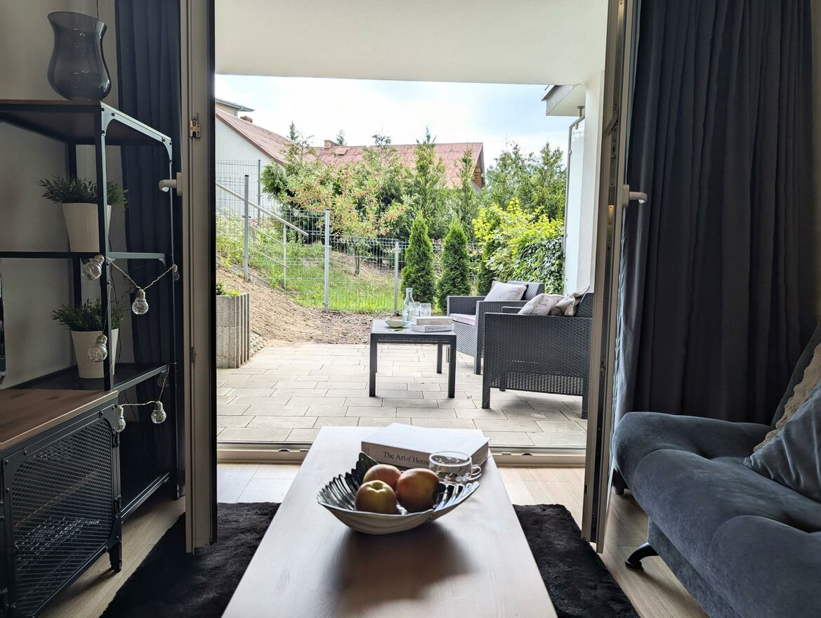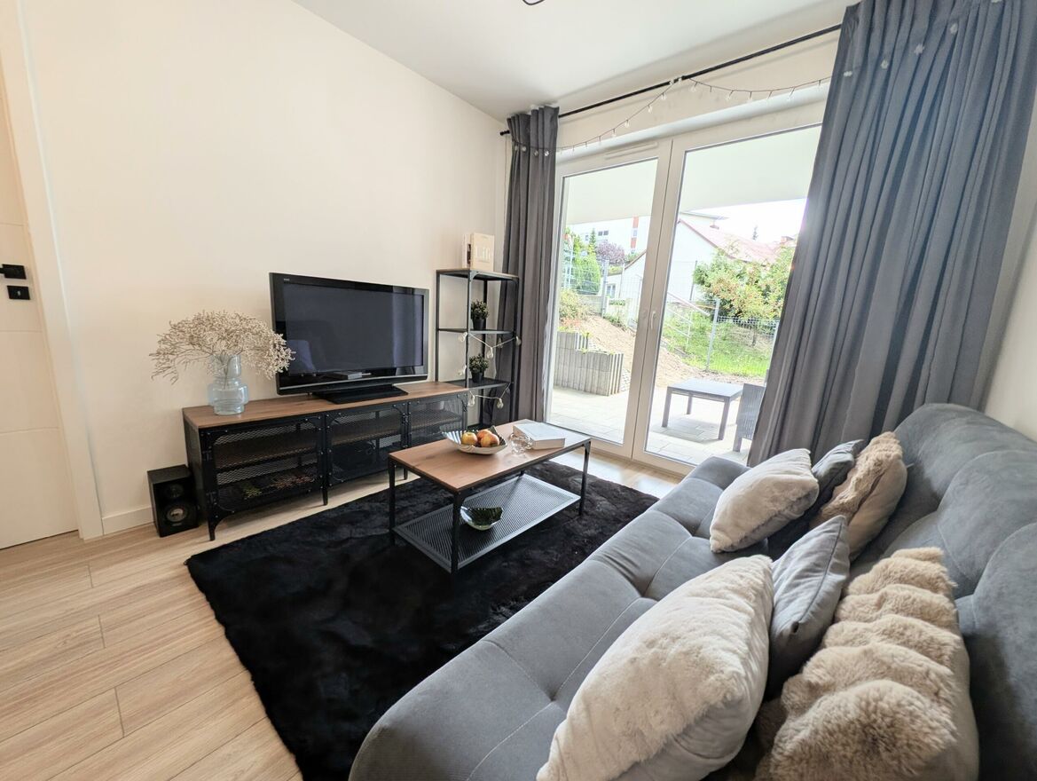 Mieszkanie ma bardzo przemyślany układ pomieszczeń: osoba sypialnia, salon z aneksem kuchennym, z którego mamy wyjście na taras/ogródek. Przedpokój funkcjonalny z dużą ilością miejsca do przechowywania oraz łazienka z wanną oraz prysznicem. Nieruchomość sprzedawana jest z pełnym umeblowaniem i sprzętami wysokiej jakości. Mieszkanie jest bardzo zadbane i umeblowane z dbałością o najmniejszy szczegół. Nie wymaga żadnego nakładu finansowego.