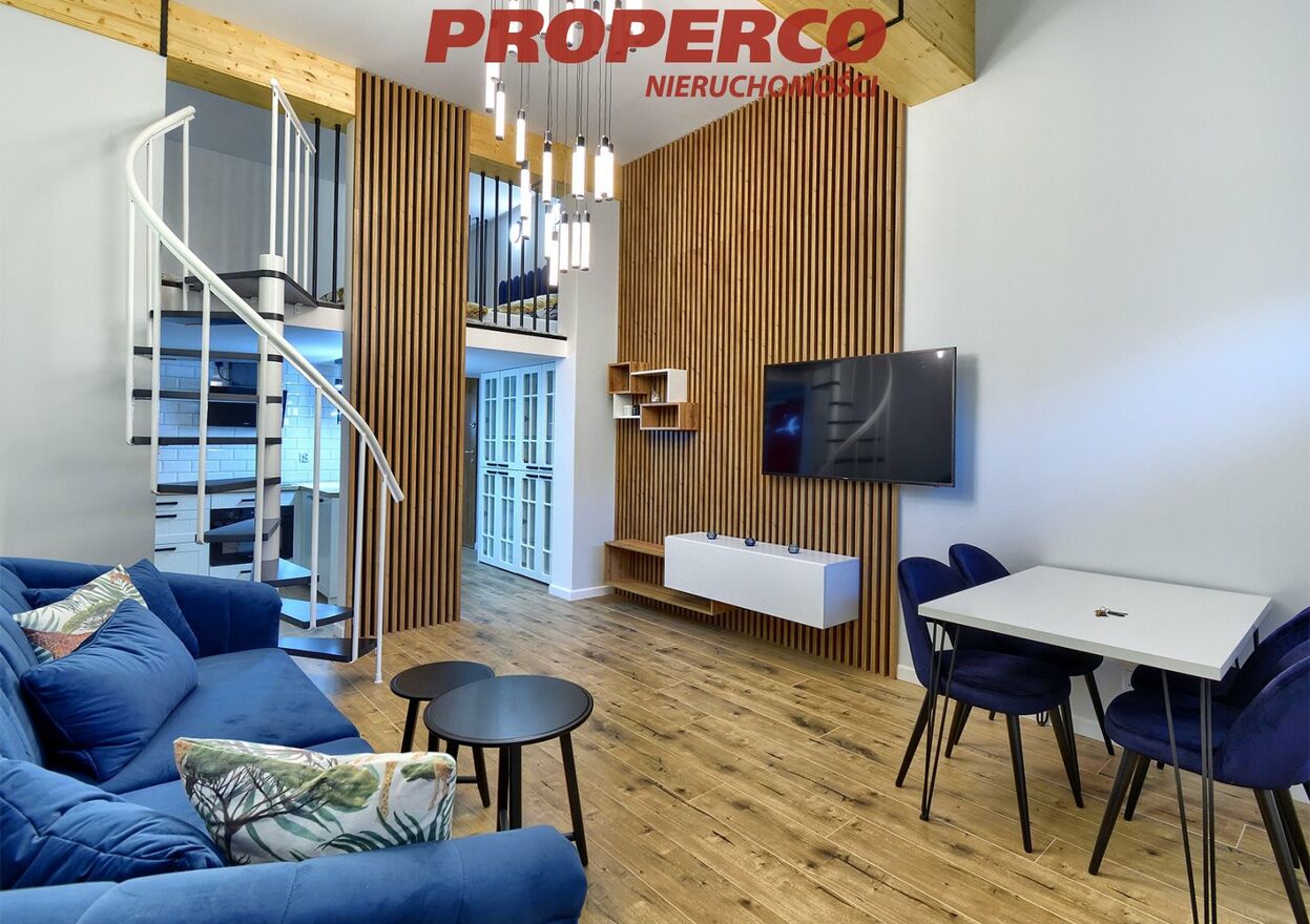 Located on the ground floor of an apartment building on Klonowa Street, in the Szydłówek neighborhood of Kielce. This 3.6-meter-high apartment is designed as a modern loft with a mezzanine, which includes a spacious and comfortable sleeping area and a walk-in closet.