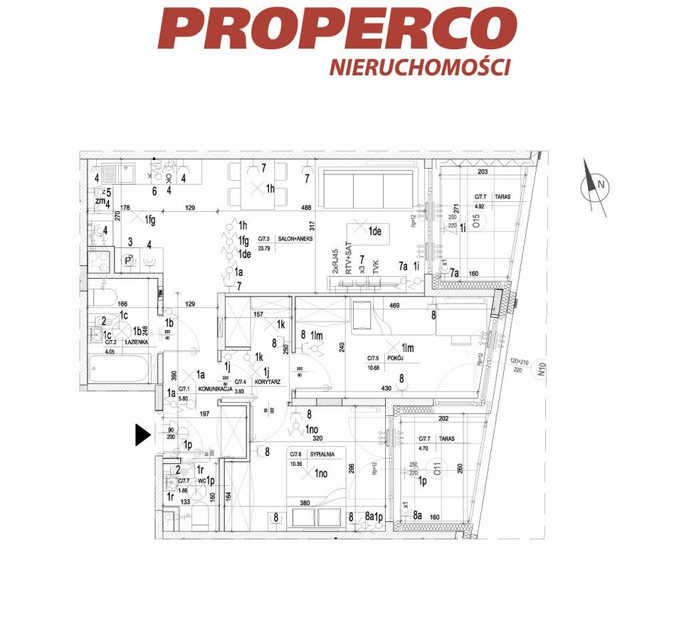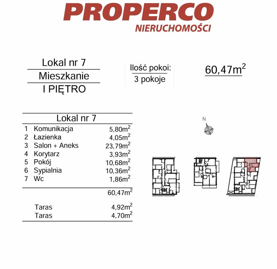Do lokalu przynależą 2 tarasy o pow. 4,92 m2 i 4,70 m2.