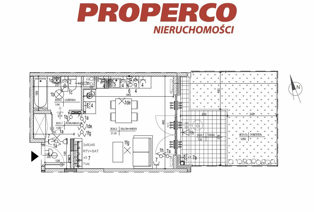 - salon z aneksem kuchennym (21,45 m2),