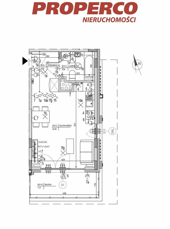 - salon z aneksem kuchennym (22,25 m2),