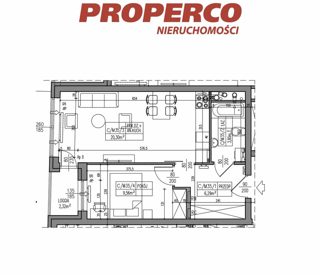 Do lokalu przynależy loggia o pow. 2,32 m2.