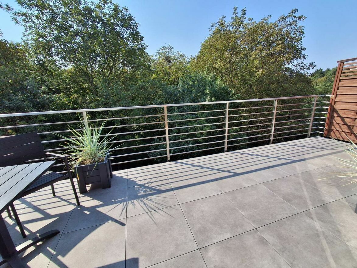 Salon z wyjściem na taras 18m2 wyłożony płytami balkonowymi gresowymi w systemie wentylowanym, wyposażony w dużą wodoodporną markizę sterowaną elektrycznie. Widok na piękny sad. Mieszkanie bardzo przestronne, ustawne, jasne i ciche.
