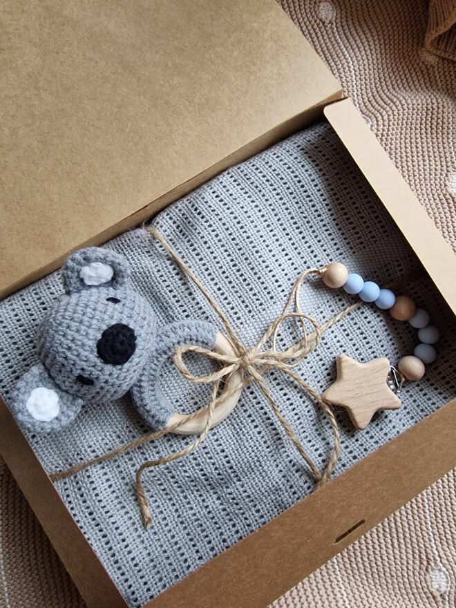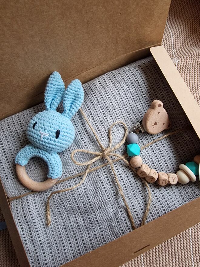 Całość zapakowana w urocze i eleganckie pudełko wym. 27cmx20cm, gotowe do wręczenia jako prezent na baby shower, narodziny dziecka lub pierwsze odwiedziny u maluszka.